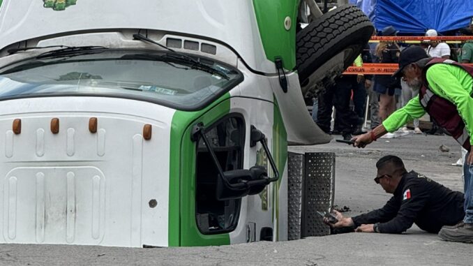 Un camión repartidor de refrescos cayó a un socavón registrado en Avenida 5, colonia Renovación de la alcaldía Iztapalapa.