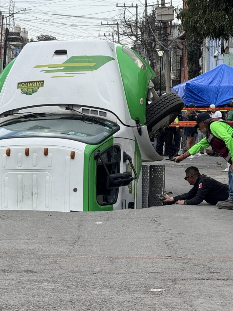Un camión de reparto en Iztapalapa se hunde en un agujero, sin heridos que lamentar.