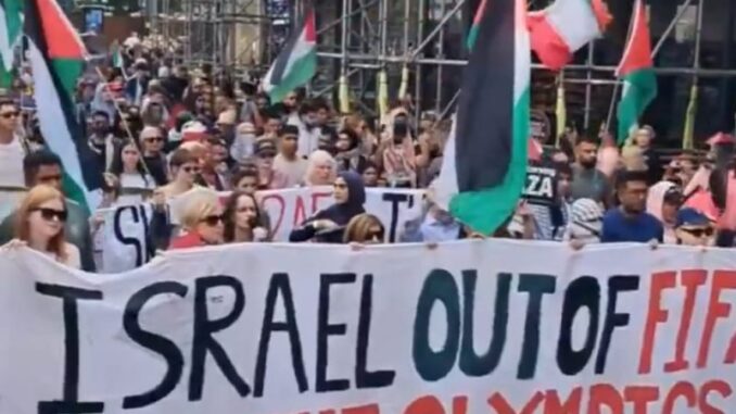 En Wembley, Inglaterra, antes del encuentro entre Manchester United y Manchester City, un grupo de aficionados se reunió fuera del estadio para exigir la expulsión de Israel de la FIFA.
